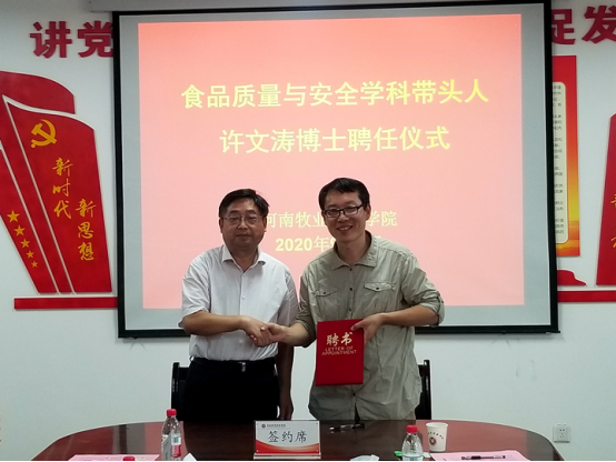为进一步深入贯彻人才强校战略,加快食品学科专业的建设步伐,学校聘任中国农业大学营养与健康研究院博士生导师,中国农业大学“人才培育发展支持计划”青年新星A类特聘研究员,“功能核酸”青年科学家创新团队负责人,北京市人类营养健康高精尖中心食品安全平台岗位科学家,农业农村部农产品质量监督检验测试中心(北京)副主任兼技术负责人,农业农村部农产品贮运保鲜质量安全风险评估实验室(北京)副主任,农业农村部农业转基因生物安全评价(食用)重点实验室副主任,国家无公害食品评审委员会委员,国际学术杂志《Journal of DNA and RNA Research》主编,《Frontiers in Bioengineering and Biotechnology》编委,《Mini-Reviews in Organic Chemistry》专栏编委(Section Editor)和《生物技术通报》、《生物技术进展》、《食品与营养科学》杂志编委许文涛为学校食品质量与安全学科带头人,许文涛长期从事食品安全功能核酸分子检测及纳米材料、精准毒理检测与评价技术、转基因生物安全三个领域的研究;他提出了“功能核酸裁剪”理论和“功能核酸纳米材料”概念,构建了高水平的“功能核酸一体化”检测平台,在微生物、重金属、生物掺伪及疾病生物标志物等快速检测方面取得了重要进展,入选教育部新世纪优秀人才和北京市科技新星。