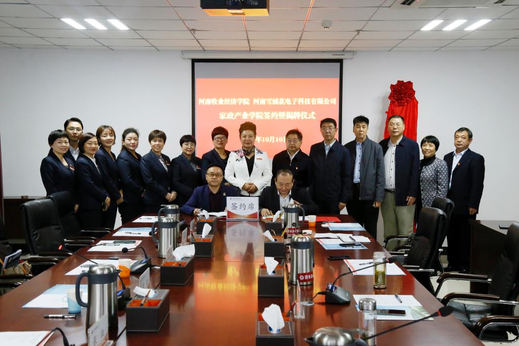 10月10日上午,学校与郑州圆方集团河南雪绒花电子科技有限公司共建家政产业学院签约暨揭牌仪式在图书馆841会议室隆重举行。校长罗士喜、副校长张卫宪,圆方集团党委书记、总裁薛荣,圆方集团党委委员、雪绒花服务集团总经理雷勇出席仪式。院长办公室、发展规划处、社会服务办公室、文法学院等部门负责人及公司方相关领导参加仪式。仪式由张卫宪主持。