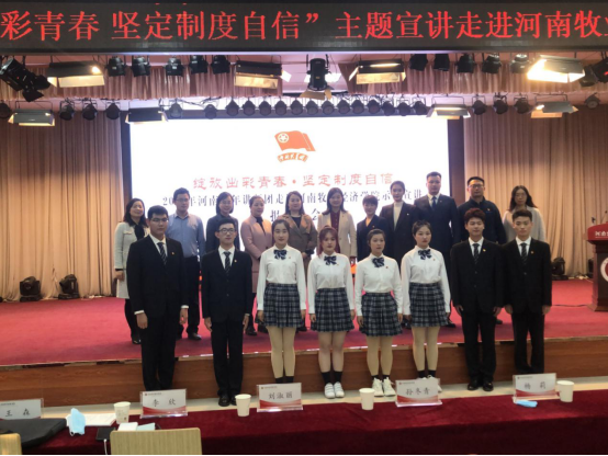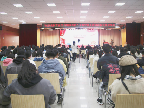 11月6日下午,团省委组织河南青年讲师团在完美官网龙子湖校区大学生活动中心举办“绽放出彩青春,坚定制度自信”示范宣讲报告会。共青团河南省委宣传部部长孙冬青、副部长刘淑丽,校团委书记杨莉出席会议,校团委全体老师、各学院团委书记及200余名学生代表聆听宣讲。报告会由讲师团成员张晓静主持。