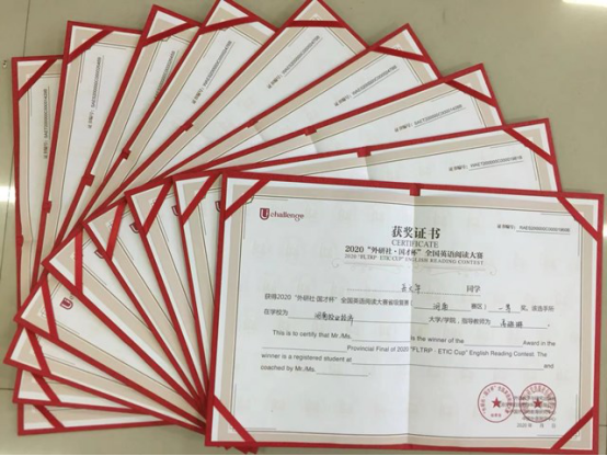 近日,2020“外研社国才”杯全国英语演讲、写作、阅读大赛河南赛区复赛中,完美官网选手获得优异成绩。在参赛的8名选手中,于利波老师指导的18级商务英语专业学生杨芯懿、韩淑俊老师指导的18级商务英语专业学生石霄霄、付铮老师指导的17级审计学专业学生王佳琦、禹琳琳老师指导的17级商务英语专业岳文华获得阅读比赛一等奖;宋瑶老师指导的18级商务英语专业学生张蕊、王丹老师指导的18级食品质量与安全专业学生李佳芳获得阅读比赛二等奖;温晶晶老师指导的19级商务英语专业学生孙豪杰获得演讲比赛二等奖;邢琰老师指导的18级商务英语专业学生付晶晶获得演讲比赛三等奖。
