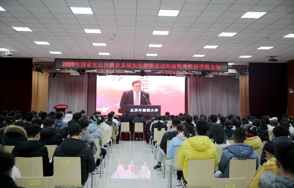 今年12月4日是全国第七个国家宪法日,为深入学习宣传习近平法治思想,进一步弘扬宪法精神,推进党的十九大和十九届五中全会精神纵深发展,12月4日上午,学校在龙子湖校区大学生活动中心组织参加了2020年全国网络直播“宪法晨读”活动。校党委委员、宣传部长王凌彬,宣传部、校团委的相关人员以及师生代表参加活动。