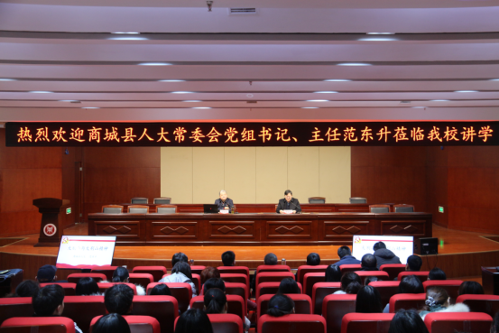 12月19日上午,商城县人大常委会党组书记、主任范东升应邀为学校师生做专题报告。报告会在龙子湖校区图书馆一楼报告厅举行,校党委副书记李俊杰出席并主持会议,校党委组织部、校党委宣传部、校团委、校学生处、社会服务办公室负责人参加报告会。各个教学院(部)党务工作负责人及旅游学院师生聆听报告。
