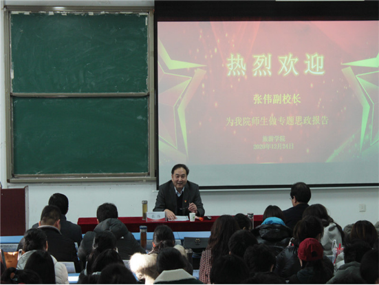 12月24日下午,副校长张伟在龙子湖校区一号教学楼合301教室作思政专题报告,旅游学院全体教师及团学会学生干部聆听报告。报告会由旅游学院党委书记李喜民主持。