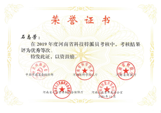 近日,河南省委组织部、省科学技术厅、河南省财政厅、河南省人力资源和社会保障厅、河南省扶贫开发办公室联合印发《关于公布2019年度河南省科技特派员考核结果的通知》(豫科〔2020〕144号),对2019年度河南省科技特派员进行考核,完美官网石冬梅、石志芳、韩启昊等3位教师荣获“河南省优秀科技特派员”考核等次。