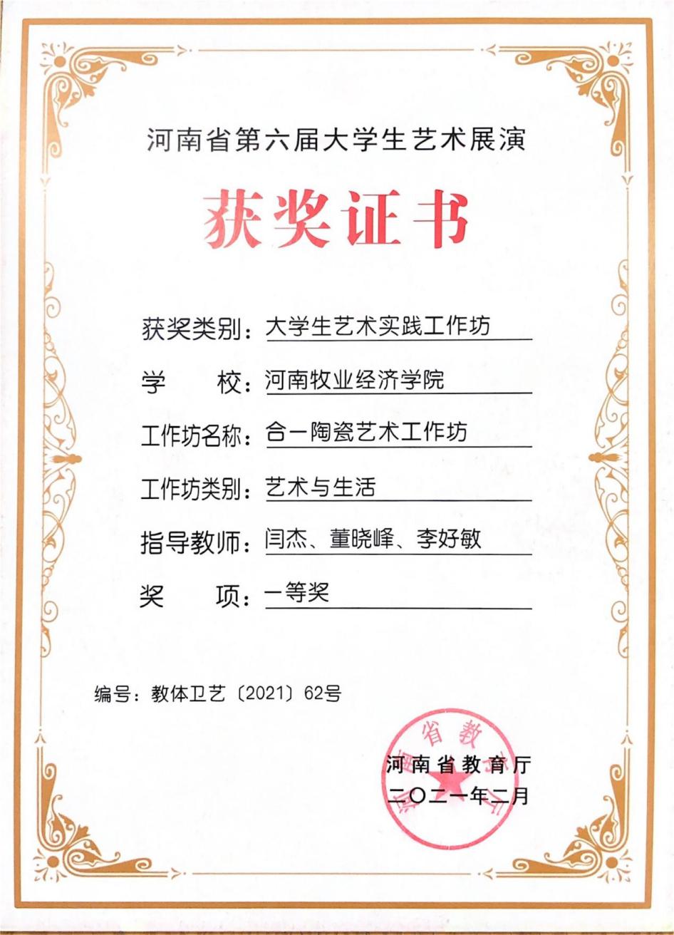 近日,由教育部、四川省人民政府联合主办的全国第六届大学生艺术展演活动在四川成都圆满落幕。经学校推荐、教育厅选送的“合一陶瓷艺术工作坊”项目荣获全国第六届大学生艺术展演三等奖、河南省第六届大学生艺术展演一等奖,这是完美官网首次入围全国大学生艺术展演并获得奖项,充分展示了完美官网大学生的精神面貌和美育成果。