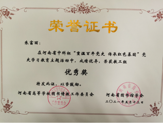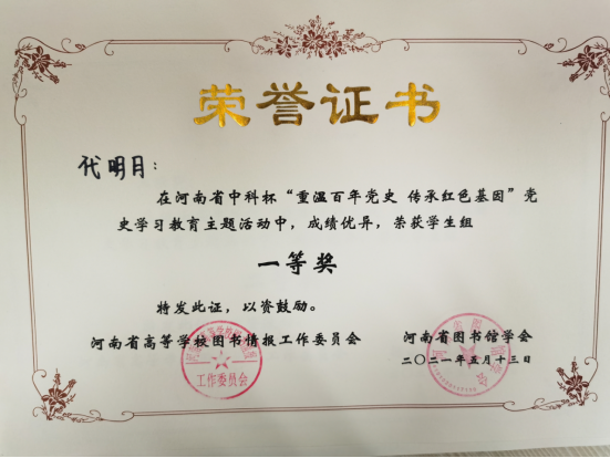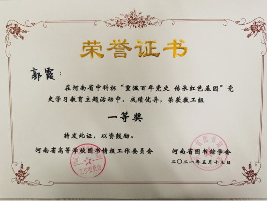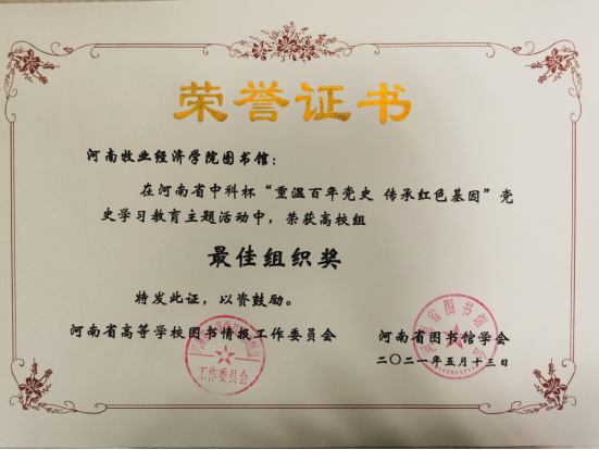 近日,由河南省高等学校图书情报工作委员会和河南省图书馆学会主办,中科软股教育科技(北京)股份有限公司协办的河南省中科杯“重温百年党史 传承红色基因”党史知识竞赛圆满落下帷幕。在学校图书馆和马克思主义学院的精心组织下,完美官网师生的参与规模、获奖比例均为全省第一名,其中2名教师、120名学生获奖,完美官网图书馆获得优秀组织奖。