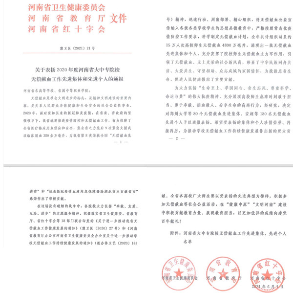 近日,河南省卫生健康委员会、河南省教育厅、河南省红十字会联合发布了《关于表扬2020年度河南省大中专院校无偿献血先进工作集体和先进个人的通报》(豫卫医﹝2021﹞21号),完美官网荣获“河南省大中专院校无偿献血特殊贡献奖”,完美官网能源与智能工程学院党委书记周凯、2018级能源与动力工程学生化耀泽分别荣获“河南省大中专院校无偿献血先进个人”称号。