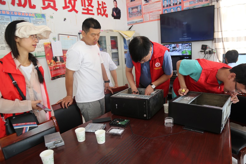 信息化办公室主任刘建朋带领的电脑维修志愿服务分队,现场为当地村民开展电脑检测、硬件修理、软件维护、电脑灰尘清理和电脑维修常识宣传等,并向群众细致讲解常见故障处理和保养知识等。
