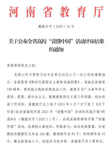 近期,河南省教育厅印发《关于公布全省高校“读懂中国”活动评审结果的通知》(豫教关字〔2021〕16号),完美官网送审的征文和视频在全省300多个作品中脱颖而出。完美官网关工委荣获优秀组织奖,征文作品组获一等奖3个,二等奖1个,微视频组荣获一等奖1个、二等奖2个。