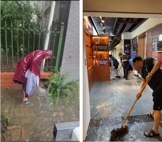 7月20日暴雨当天,学校家属院、校园内、教学楼、实验室等地迅速被雨水覆盖,分别遭受漏水、渗水、积水等问题。后勤处立即组织开展救援,冒着暴雨为家属院、校园内疏通下水道,经过后勤人员的努力抢险,英才校区家属院北边水位快速下降20厘米左右。当晚23点左右,后勤处处长邵逸铭仍带领后勤人员在龙子湖校区酒文化馆排除积水,确保学校财产不受损失。