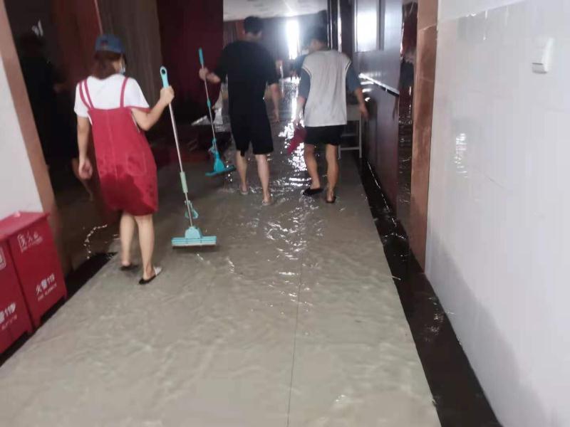 7月21日上午8:00,大学生活动中心4楼积水严重。校党委组织部部长戴天增,后勤处书记李领、处长邵轶铭等同志现场指挥并参与抢险排水工作。党委学生工作部(学生工作处)组织学生积极参加排水清理工作。现场数10人用盆舀水、拖把推水。上午11:00,各房间的积水清理干净,减少了器材、设备被水浸泡的损失。