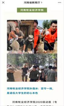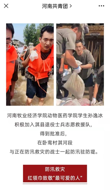 广大团员青年积极响应学校号召,英勇奋战在防汛抢险一线。动物医药学院学生孙逸冰加入淇县退役士兵志愿救援队,救援和转移群众约150人;他爬陡坡、走断路、过山洞,为淇县黄洞乡山区的石老公村和温坡村群众临时安置点送去47箱牛奶,10箱面包,18箱泡面,用实际行动诠释了“退伍不褪色”的青春担当;孙逸冰的防汛救灾事迹先后被河南省教育厅、团省委官微报道。