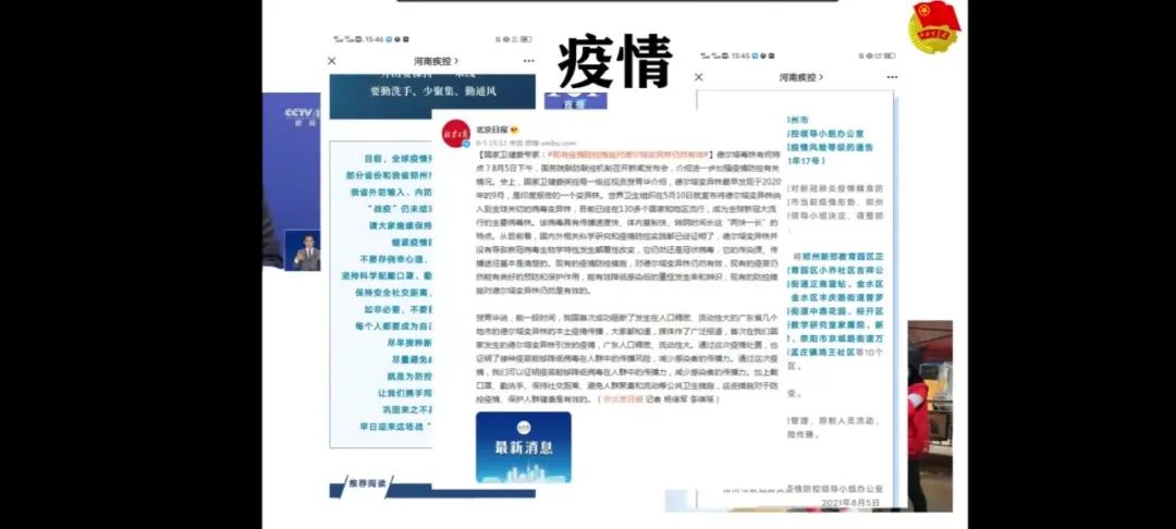 外国语学院各班级团支部通过视频形式向大家介绍了暴雨肆虐,防汛救灾中感人事迹;疫情反弹,疫情防控人人有责。天灾无情,人间有爱。坚定了防疫抗疫的信心。