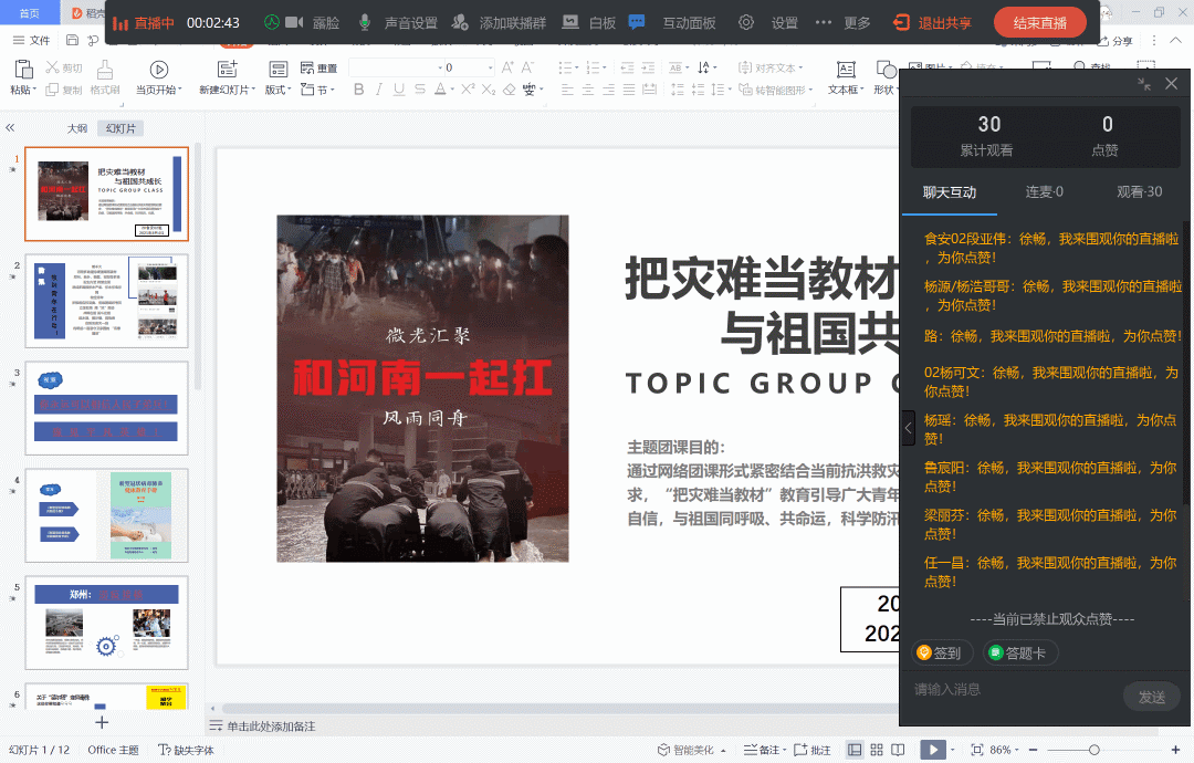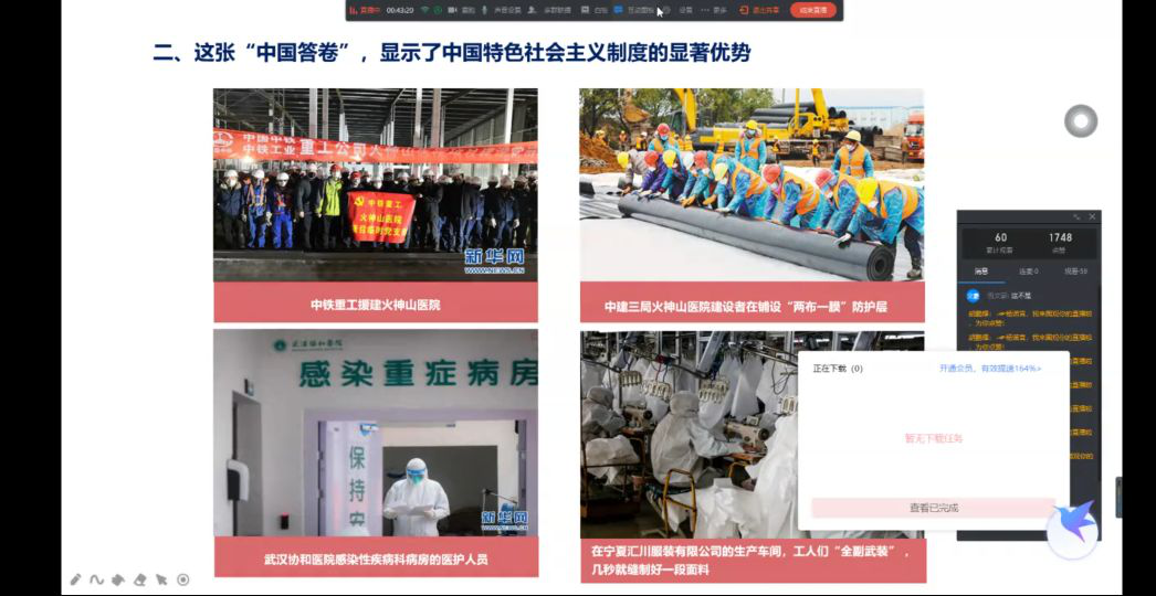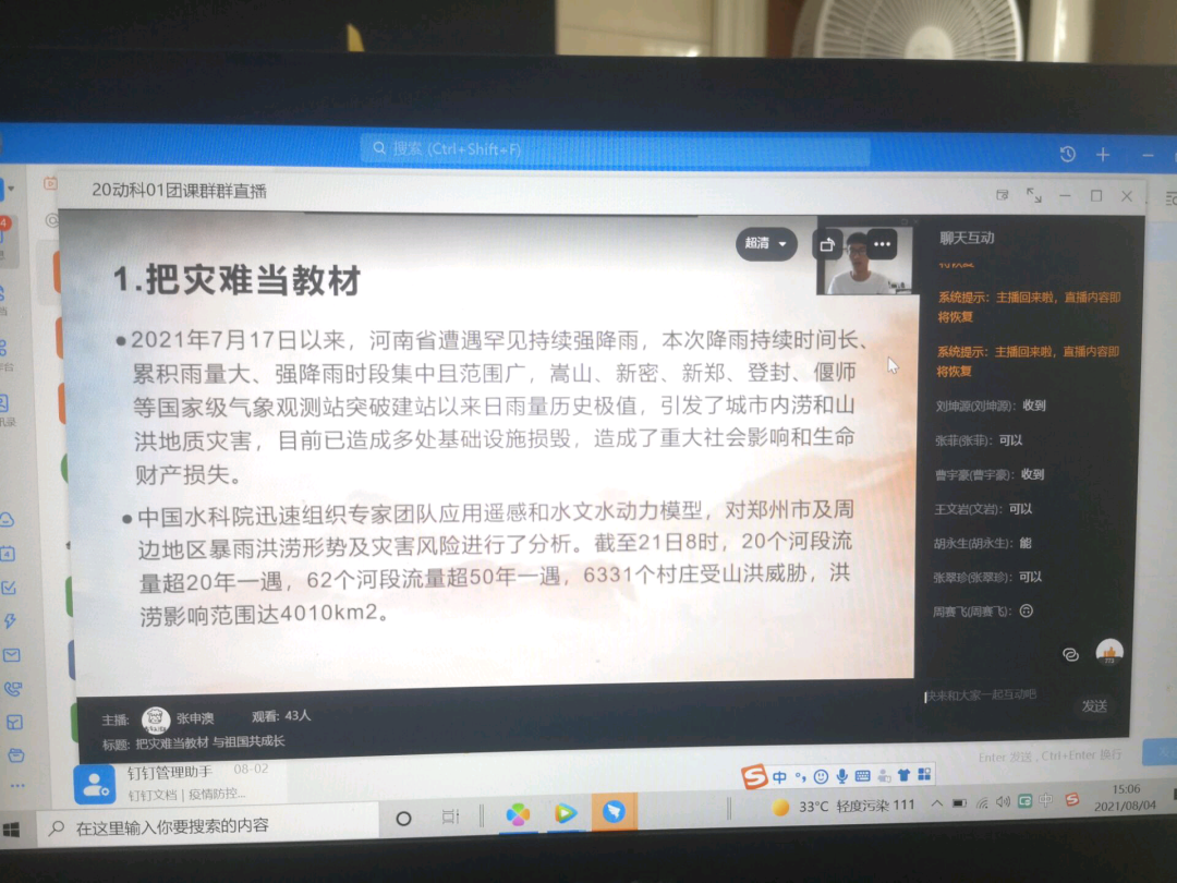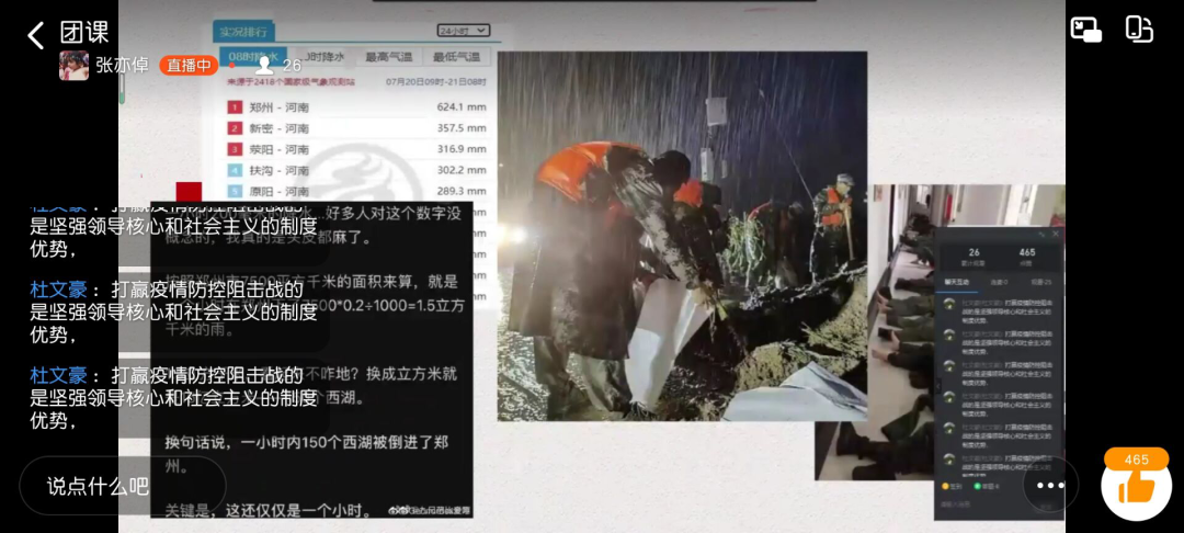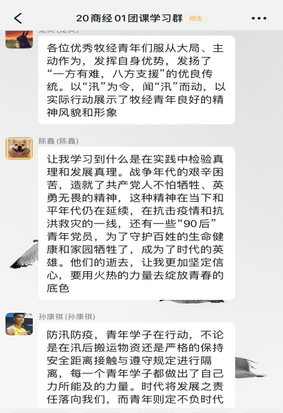 动物科技学院以云课堂的方式开展本次团课。在团课上,各班级团支部讲述了救灾及疫情的相关新闻,呼吁大家为防汛及疫情防控献出自己的一份力。通过本次团课,学生更加明白自己身上的担当及责任,作为大学生,更应通过自身行动,展现时代力量。