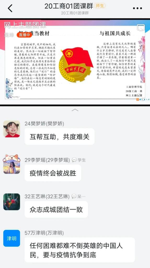 工商管理学院各班级团支部在团课上收看防汛救灾特别节目《一起扛》,并宣读了防疫倡议书。各团支部通过群聊讨论防疫知识、分享战“疫”事迹、总结学习心得,整体氛围积极有序,学习热情饱满。通过本次主题团课,工商学子获益匪浅。各团支部的团员加强了对疫情、水灾防控知识的了解,消除了恐慌心理。