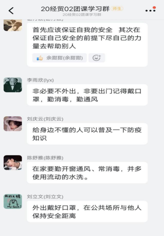 信息工程学院(软件学院)各班级团支部向大家说明疫情险情的严峻性,同时也向学生提出了应积极行动、主动作为,在党和人民最需要的地方绽放青春之花。团员纷纷表示将会在疫情防控中团结一心、共克时艰,担当新时代青年责任。