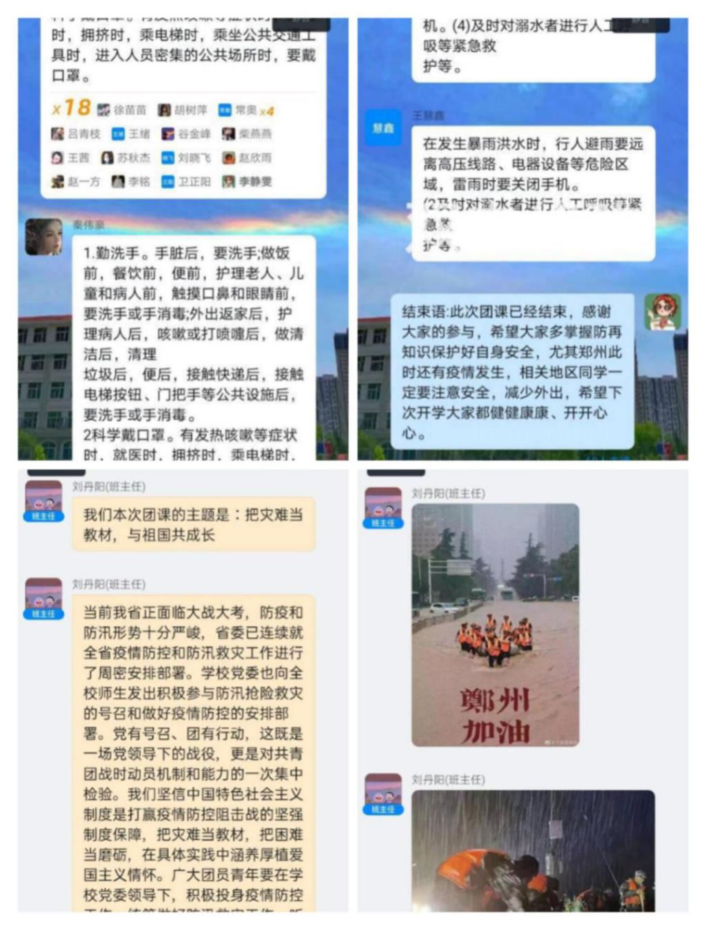 通过团课,青年学生认识到了生活哪有那么多岁月静好,只不过是有人替我们负重前行。致敬在防汛救灾一线努力拼搏的“无名英雄”,致敬在灾情面前的“逆行者”,致敬每一个为战胜汛情而默默付出的“平凡人”。(各二级学院团委供稿)