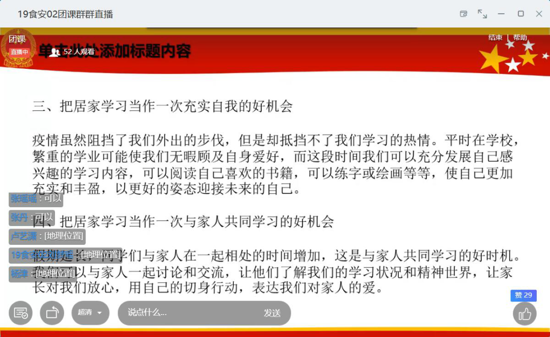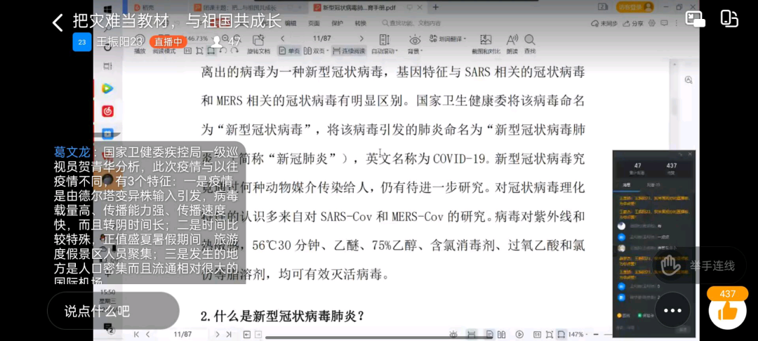 包装与印刷工程学院各班级团支部通过连麦提问、讨论、观看视频等多种形式展开本次团课,一同学习防控的有关规定,同时还有学生介绍了自己亲身经历洪水到来时的真实情况,讲述了在防汛和防疫过程中身边众志成城、共克时艰的榜样故事。团课结束后,学生纷纷表示将自觉遵守防疫要求和规定,科学防控疫情,做好防疫宣传教育,承担起青年人的责任与担当。