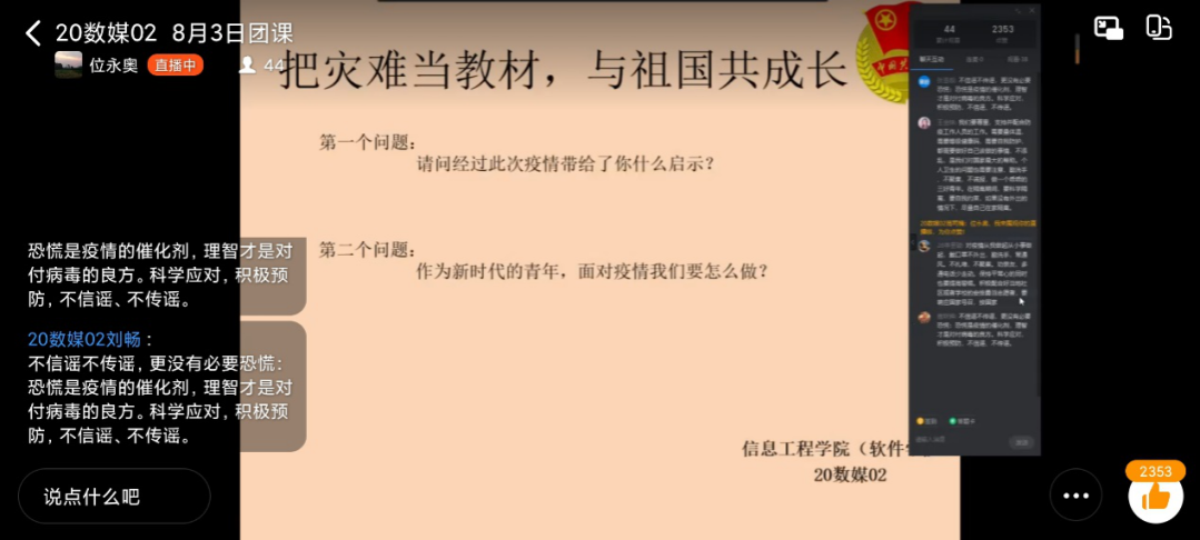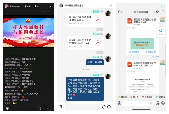 文法学院各班级团支部结合各种新闻资源,为学生分析了在家中为灾后整治以及疫情防控贡献自己的一份力量的重要性。让学生感受到中华民族的伟大精神力量是战胜灾情、疫情的有力武器。
