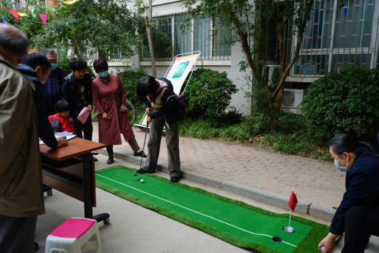 活动项目眼疾手快、驱赶病毒、挑战不可能、幻影弹弹球、潇洒高尔夫、民间传统投壶、幸运摸彩球、欢乐摇骰子在活动场地周围依次排开,每位老同志结合自身情况参加活动。大家时而奋力投篮,时而小心挥杆,不论成绩如何,脸上都洋溢着开心的笑容。