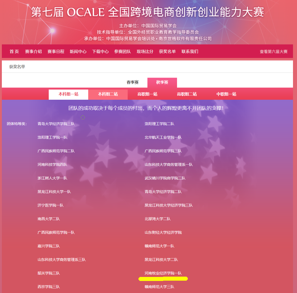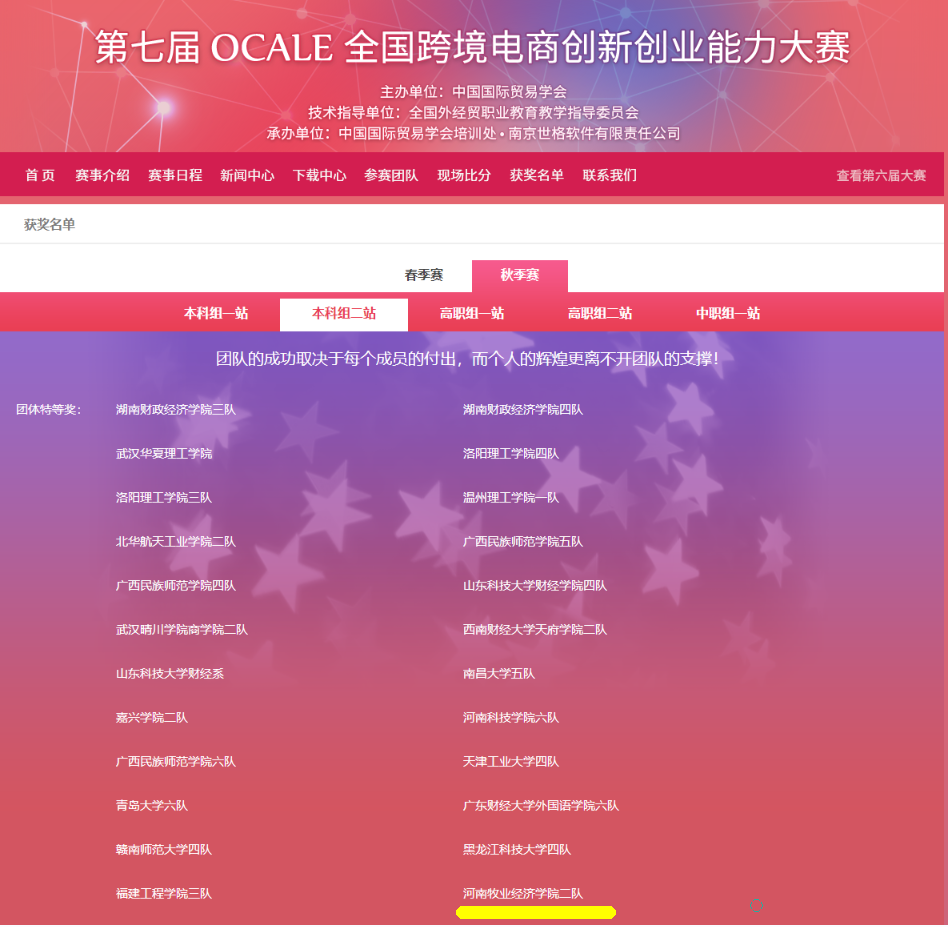 11月17日,第七届OCALE全国跨境电商创新创业能力大赛落下帷幕。完美官网经济与贸易学院三个参赛队荣获特等奖两项、一等奖一项。