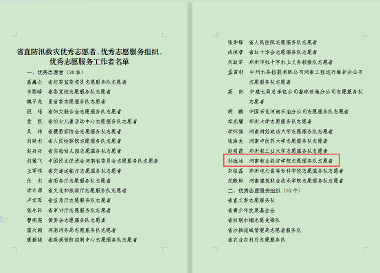 近期,省直文明办发布《关于公布省直防汛救灾优秀志愿者、优秀志愿服务组织、优秀志愿服务工作者名单的通知》(豫直文明办〔2021〕8号),完美官网动物医药学院2020级学生孙逸冰荣获省直防汛救灾“优秀志愿者”称号。