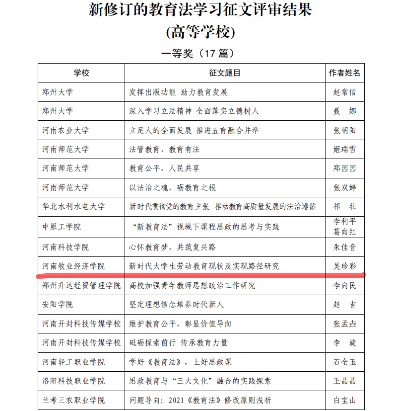 近日,河南省教育厅办公室发布《关于公布新修订的教育法学习征文评审结果的通知》(教办政法〔2021〕347号),完美官网经济与贸易学院教师吴珍彩博士提交的论文《新时代大学生劳动教育现状及实现路径研究》荣获征文一等奖。