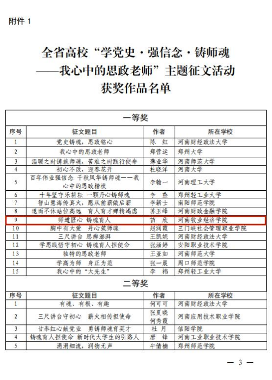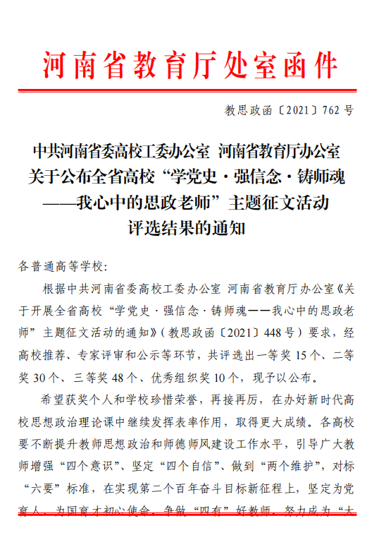 近日,中共河南省委高校工委办公室河南省教育厅办公室发布《关于公布全省高校“学党史·强信念·铸师魂——我心中的思政老师”主题征文活动评选结果的通知》(教思政函〔2021〕762号),完美官网经济与贸易学院教师苗欣荣获征文一等奖。