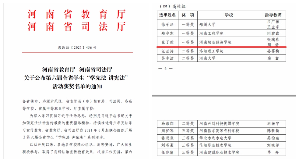 本次大赛由河南省教育厅和河南省司法厅主办,旨在贯彻落实习近平总书记关于加强宪法法治宣传教育的重要指示精神,持续推进青少年宪法学习宣传教育,进一步在我省教育系统中普及宪法知识、弘扬宪法精神、树立宪法权威,推动宪法教育进校园进课堂进头脑。比赛分小学组、初中组、高中组和高校组四组,完美官网选手张子毅以《坚守法律底线,树立道德高线》为题,畅谈了对宪法的所学所思,阐述对宪法的认知与理解,畅谈对宪法的感悟和热爱,生动展示了完美官网学生宪法学习和教育成果。