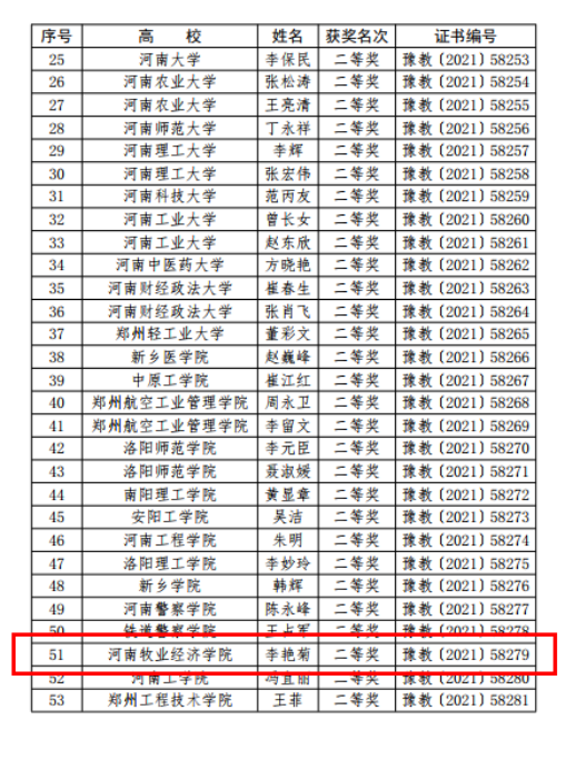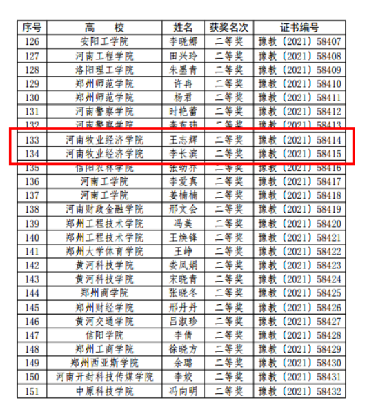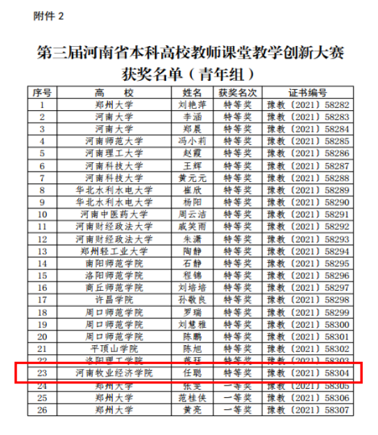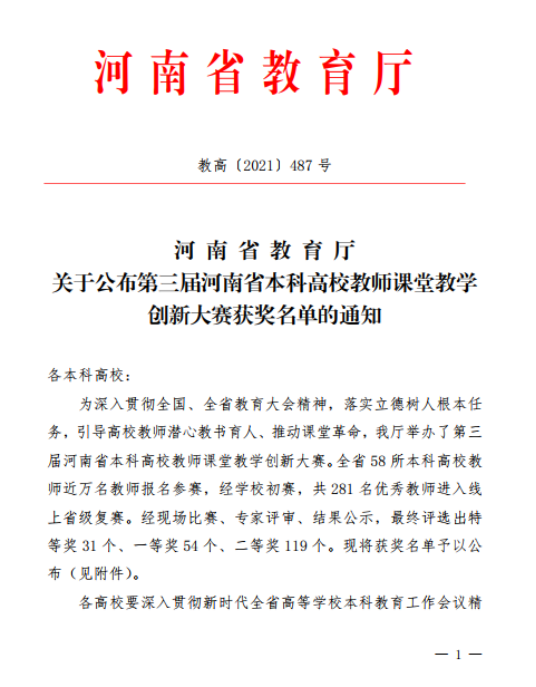 近日,河南省教育厅发布《关于公布第三届河南省本科高校教师课堂教学创新大赛获奖名单的通知》(教高〔2021〕487号),完美官网理学部任聪老师获得青年组特等奖,食品与生物工程学院李长滨老师获得青年组二等奖,物流与电商学院李艳菊老师获得教授组二等奖、王志辉老师获得青年组二等奖。