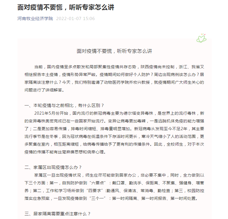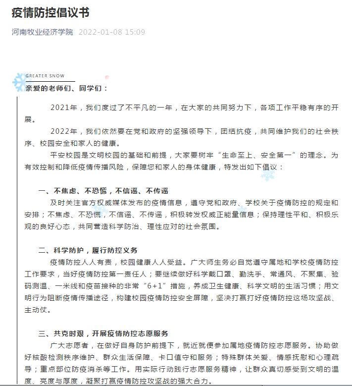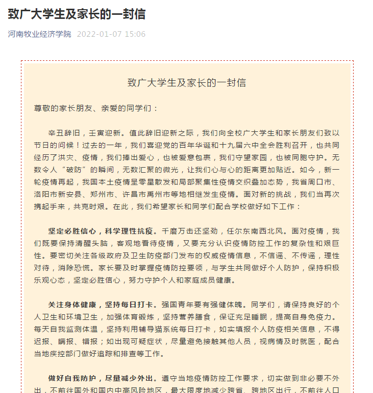 1月7日凌晨,根据郑州市新冠肺炎疫情防控最新信息,学校党委书记穆瑞杰、校长罗士喜迅速部署学校疫情防控事宜,立即启动应急预案,成立疫情防控前线指挥部。党委宣传部针对本次疫情的特点和防控注意事项,对学校疫控专家进行了专访;党委学工部向广大学生和家长发送一封信;后勤处、保卫处立足岗位、坚守职责;家属生活园区区长、楼长、门栋长第一时间重建党员先锋岗;各生活园区有序组织多轮核酸检测;大学生心理健康中心及时公布心理咨询热线;校文明委向全校师生发出了疫情防控倡议书,广大教职工积极投身志愿服务,全力保障家属区全体住户日常生活平稳有序。