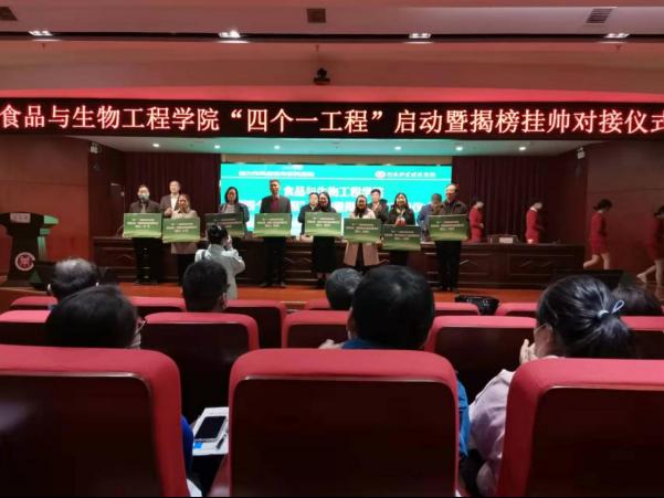 仪式上,食品与生物工程学院副院长郝修振宣读了食品与生物工程学院揭榜挂帅对接结果,校领导为揭榜人颁发揭榜挂帅对接牌。(食品与生物工程学院供稿)