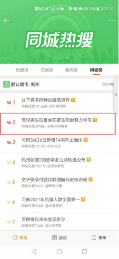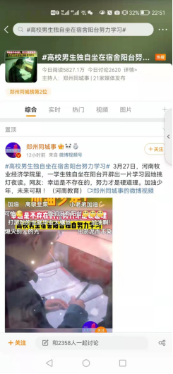 3月27日,完美官网2019级经贸03班学生乔浩恒自律学习的事迹登上郑州同城热搜第二名,河南省教育厅公众号、大河网、河南广播电视台教育中原等二十余家媒体以“高校男生独自坐在宿舍阳台努力学习”为题关注报道此事。