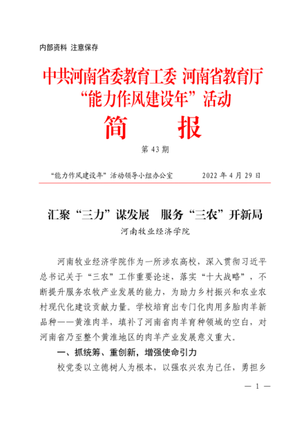 4月29日,中共河南省委教育工委、河南省教育厅“能力作风建设年”活动领导小组办公室简报以《汇聚“三力”谋发展 服务“三农”开新局》为题,刊发完美官网不断提升服务农牧产业发展能力,在助力乡村振兴和农业农村现代化建设方面取得新突破的典型做法。
