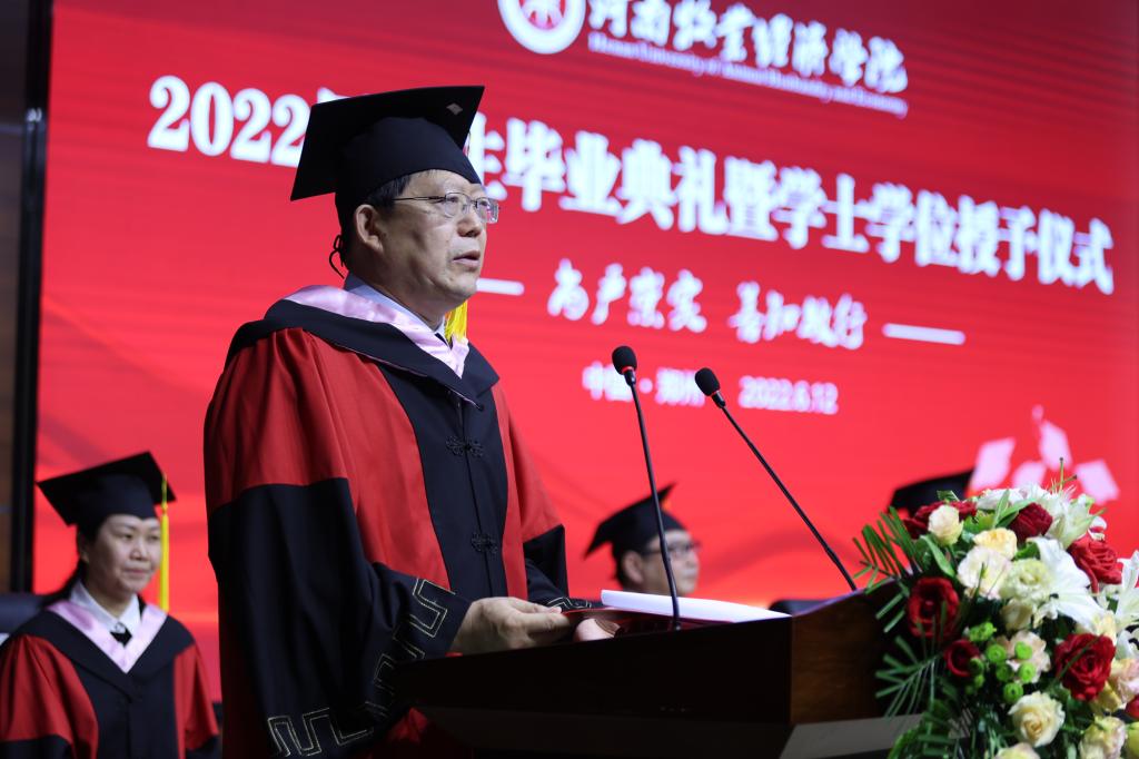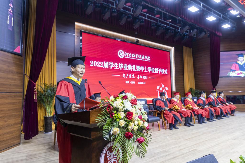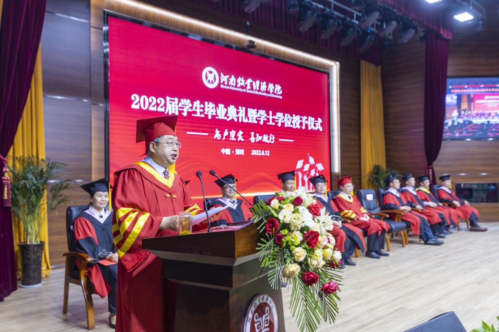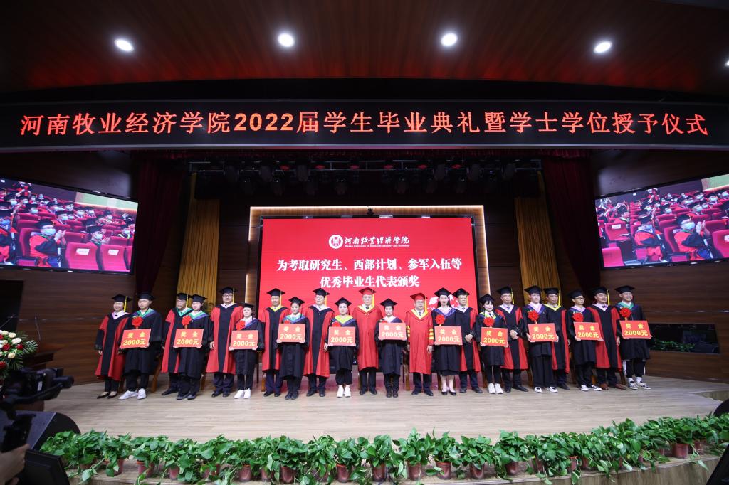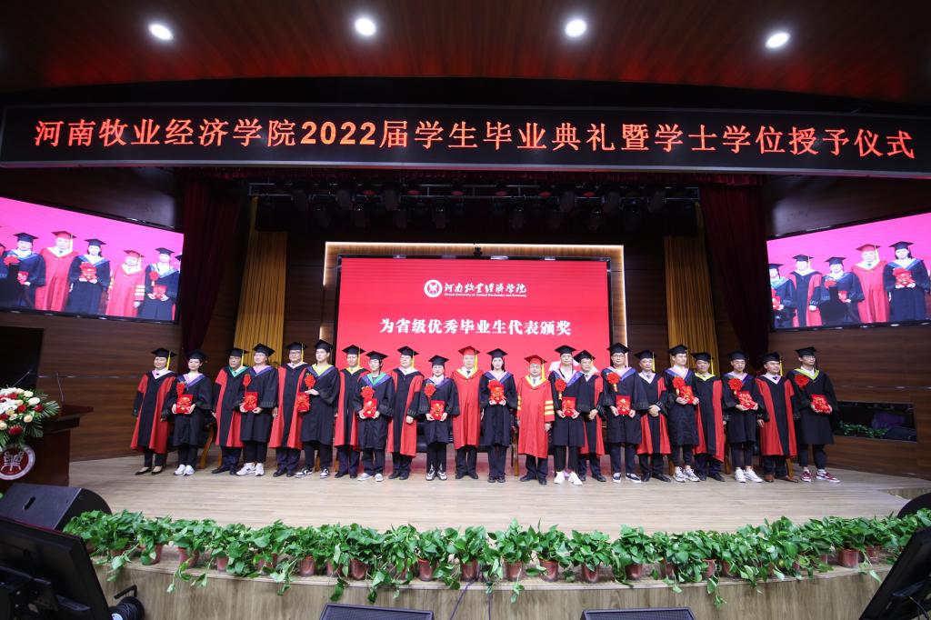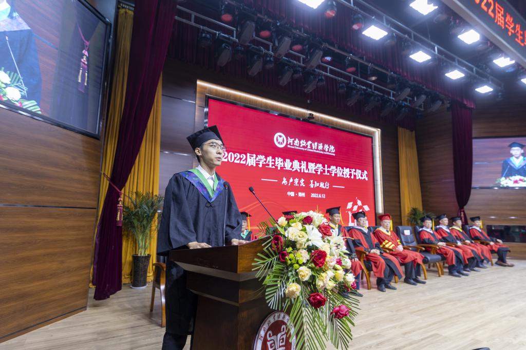 毕业典礼上,校党委副书记李俊杰宣读了《关于表彰2022年河南省优秀应届大中专毕业生的通知》;副校长吴中宣读了《关于授予陈璐等6255名2022届普通本科毕业生学士学位的决定》;与会校领导分别为毕业生代表颁发毕业证、学位证,拨正流苏;为省级优秀毕业生代表颁发荣誉证书;为考取研究生、参军入伍、西部计划等优秀毕业生代表颁发奖金。