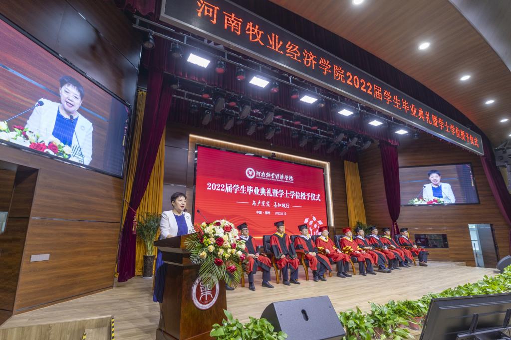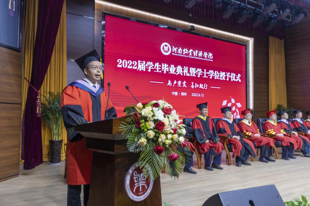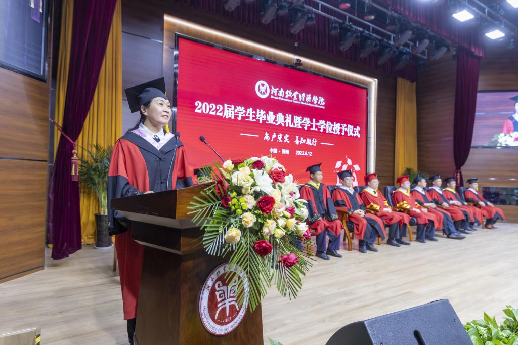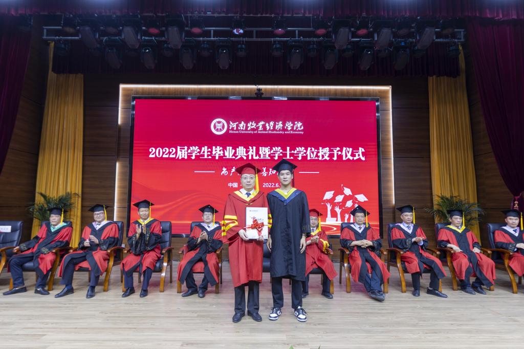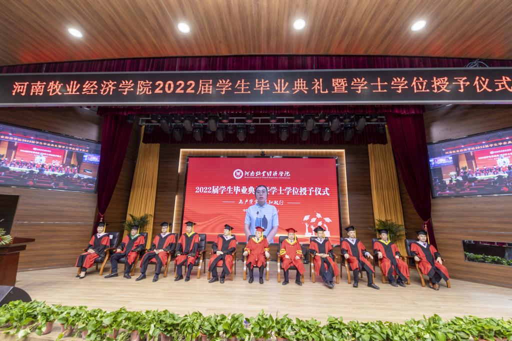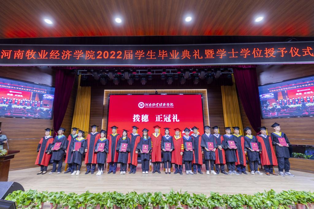 毕业典礼上,校党委副书记李俊杰宣读了《关于表彰2022年河南省优秀应届大中专毕业生的通知》;副校长吴中宣读了《关于授予陈璐等6255名2022届普通本科毕业生学士学位的决定》;与会校领导分别为毕业生代表颁发毕业证、学位证,拨正流苏;为省级优秀毕业生代表颁发荣誉证书;为考取研究生、参军入伍、西部计划等优秀毕业生代表颁发奖金。