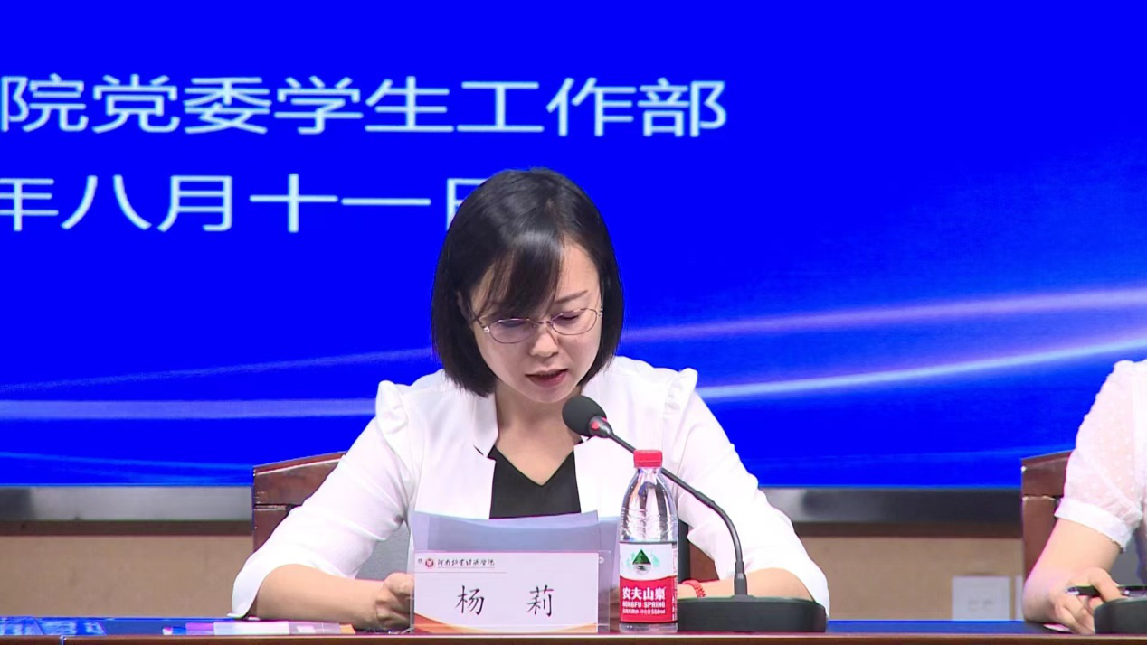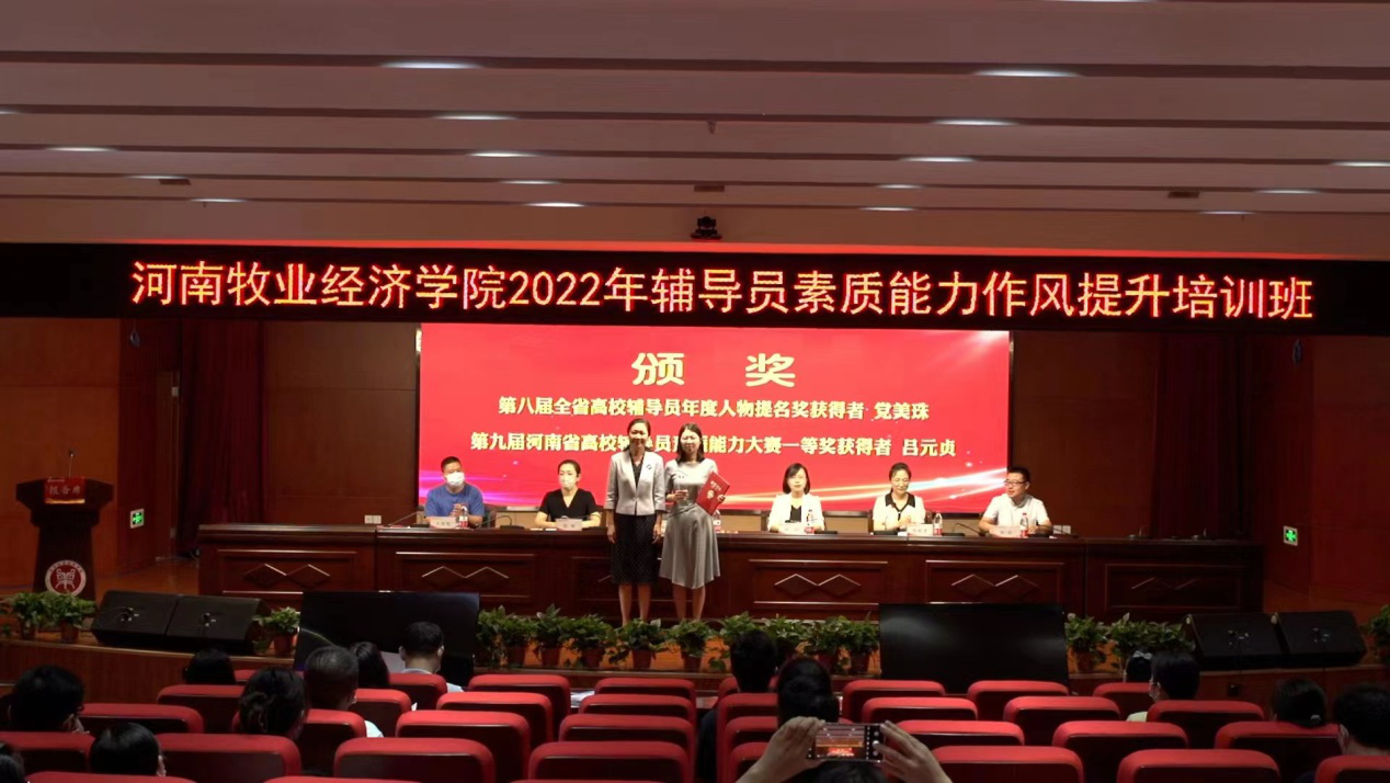 会上,杨志清为第八届全省高校辅导员年度人物提名奖获得者党美珠、第九届河南省高校辅导员素质能力大赛一等奖获得者吕元贞颁奖;校团委书记、学工部副部长杨莉宣读了《关于举办2022年辅导员素质能力作风提升培训班的通知》;动物医药学院团委副书记(学工办副主任)陈雁雪作为学员代表发言。