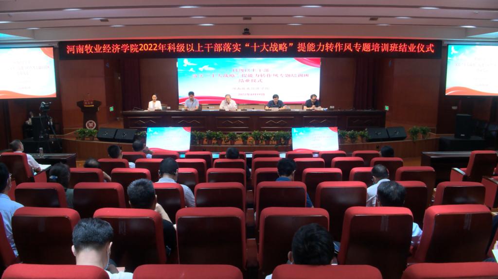 为深入学习贯彻习近平总书记视察河南重要讲话重要指示,认真落实党的十九届六中全会和省第十一次党代会精神,进一步推动科级以上干部以更加过硬的能力、更加自觉的担当和更加优良的作风投身省委“十大战略”,8月16日至19日,学校通过线上与线下相结合的形式举办科级以上干部落实“十大战略”提能力转作风专题培训班。学校领导及全体科级以上干部参加了本次培训。