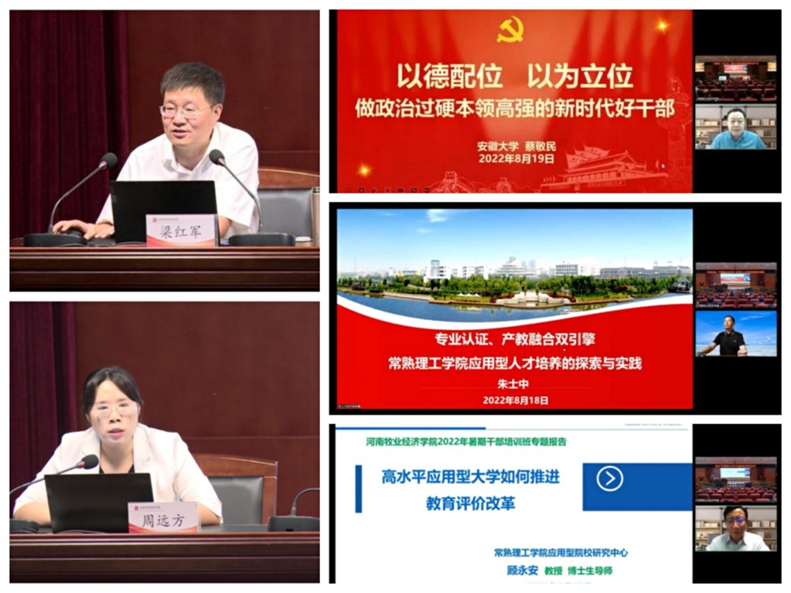 学校特邀安徽大学党委书记蔡敬民教授、常熟理工学院党委书记朱士中教授、常熟理工学院应用型院校研究中心主任兼华中科技大学博士生导师顾永安教授、中共河南省委党校科技文化教研部副主任梁红军教授及周远方博士等专家分别从干部能力作风建设、应用型人才培养、教育评价改革、实施科教兴省人才强省战略、意识形态等方面作了精彩报告。五场专题报告主题鲜明、见解独到,旁征博引、内涵丰富,深入浅出、引人入胜,既有宏观,又有细节,既讲理论,又谈方法,具有很强的启发性、指导性和实践性。对学校深化教育评价改革、提升人才培养质量、打造高素质干部队伍、建设高水平应用型大学具有重要的现实指导意义。
