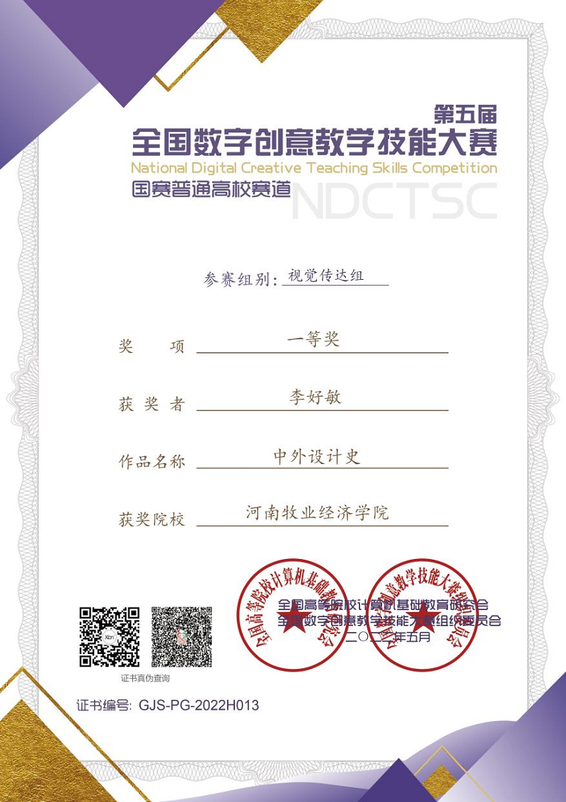 本届全国数字创意大赛共收到507所普通高等院校的3500余位教师的投稿作品,最终898部作品进入全国决赛。李好敏选报的参赛项目《中外设计史》荣膺一等奖。