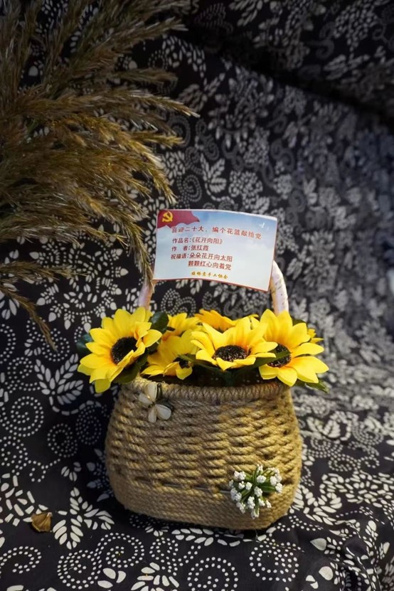 活动期间,老师们认真观摩、虚心请教,凭借灵巧的双手、新颖的创意,经过剪杆、粘贴、编织、装饰等一番制作后,看似普通的麻绳、花杆、花布、一次性餐盒等,变成了一件件赏心悦目、独具匠心的花篮手工艺品。大家为自己的作品装满鲜花、绿植等饰物,并精心制作了一张张诗意十足的祝福卡片,祝愿中国共产党永葆青春活力,祝愿伟大的祖国永远繁荣昌盛。老师们把对党和国家的真挚感情、对喜迎党的二十大的美好期盼之情编织进花篮里,寄托于花语中,以篮表意,以花传情,以卡寄语,纷纷表示将一如既往的以饱满的精神、良好的状态投入到工作中,为学校教育事业高质量发展贡献力量,以优异成绩喜迎党的二十大胜利召开。