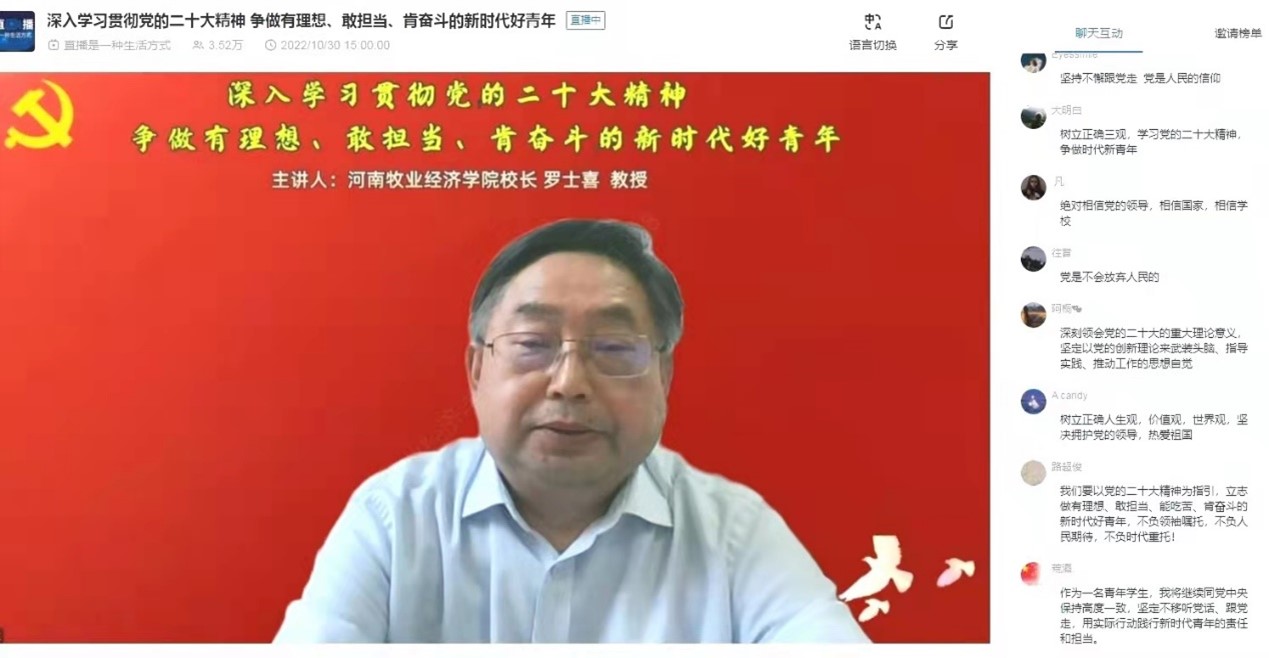 整场报告主题鲜明深刻、脉络清晰、站位高远,具有很强的启发性和感染力,引起了师生的强烈共鸣,大家备受鼓舞,纷纷在直播间积极发表感想,并表示一定紧跟时代步伐,认真学习贯彻党的二十大精神,将学习成效转化为工作学习的强大动力,牢固树立自信自强、守正创新、谦虚谨慎、艰苦奋斗的理想信念,为全面建设社会主义现代化国家、全面推进中华民族伟大复兴而团结奋斗!(党委学生工作部 杨晨 文/图)