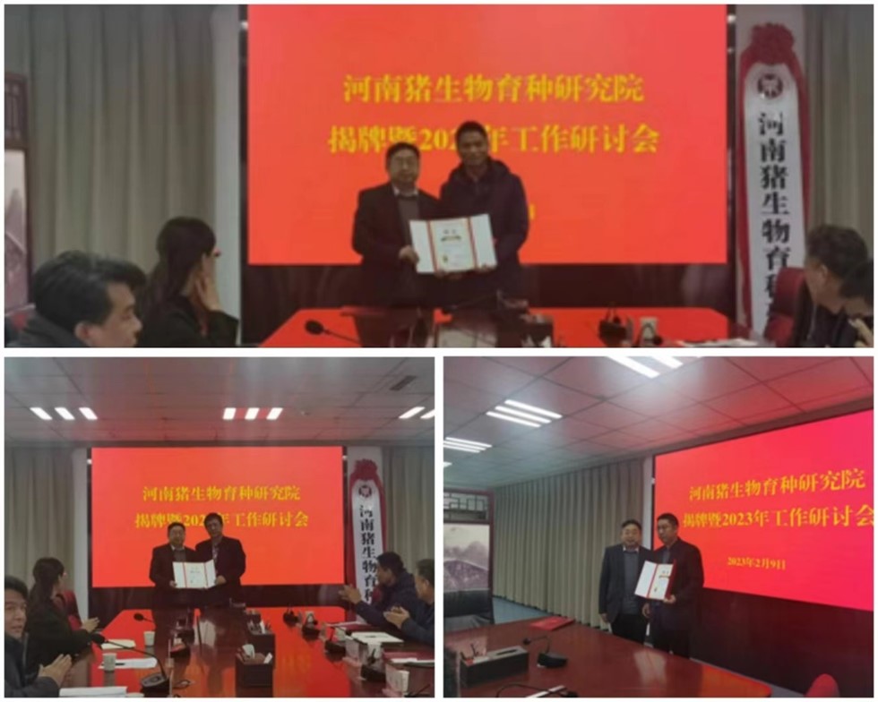 罗士喜与闫明菲为河南猪生物育种研究院揭牌,为丁向东、张宁和李凯颁发聘书。