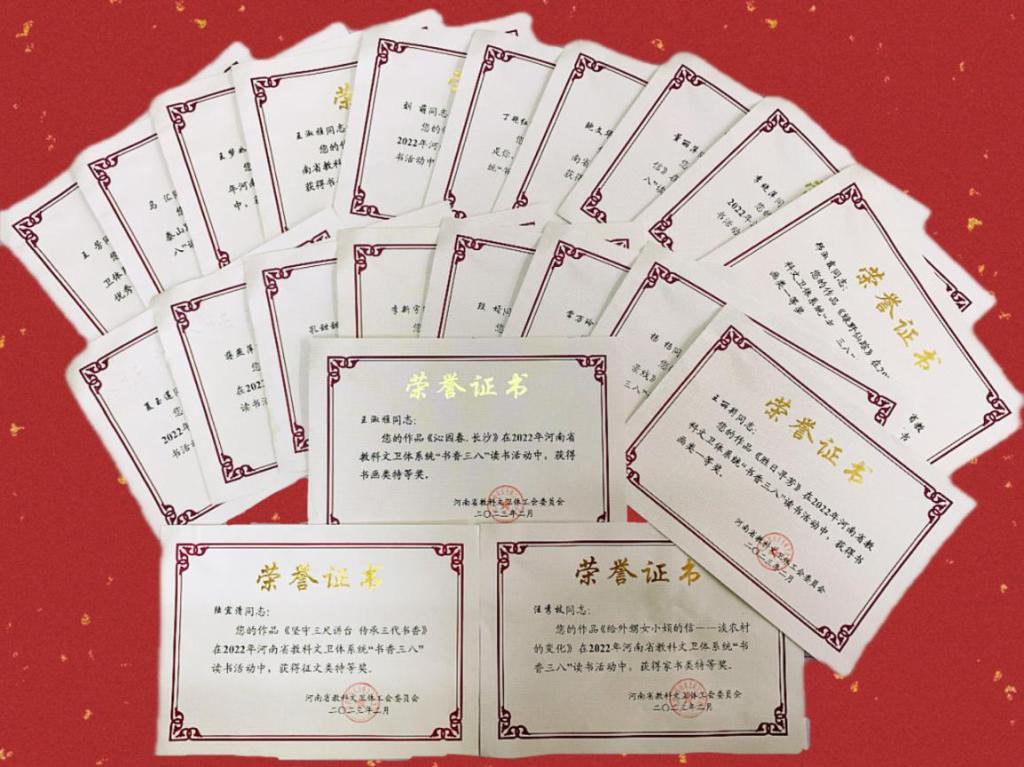 近日,由河南省教科文卫体工会主办的第五届“书香三八”读书活动评选结果揭晓,学校报送的女教职工作品共有21件获奖,获奖作品数量、等次创历史新高,受到全省通报表彰。