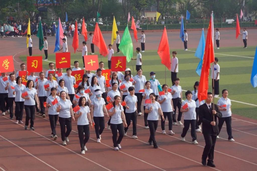 沐浴朝阳,鲜艳的五星红旗冉冉升起。田径场上,彩旗飘扬,人声鼎沸,气势如虹。在激昂的运动员进行曲中,国旗队、校旗队、彩旗队、裁判员代表队、14个学院学生运动员代表方队和28个教工分工会代表方队气宇轩昂踏入赛场。本届运动会召开时值全面学习贯彻党的二十大精神和习近平新时代中国特色社会主义思想之际,“学习党的二十大,奋进新征程”、“启智润心,凝心铸魂”的标语牌、展翅高飞的和平鸽、科技动感的机器人、梦幻炫酷的彩色烟雾、栩栩如生的金狮跃动……方队入场展示别出心裁,独树一帜,百花齐放,精彩纷呈,既彰显专业特色,又弘扬了中国传统文化,更展现了学校师生听党话、感党恩、跟党走的信心与决心。