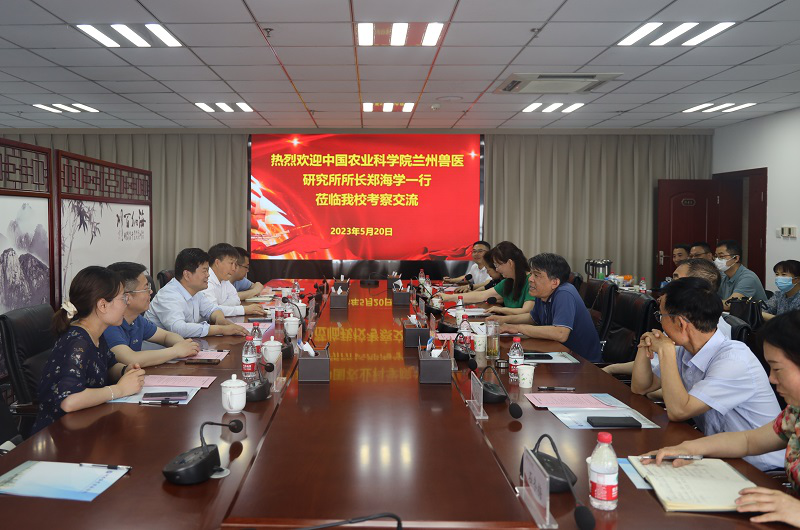 近日,为进一步推进科技创新、人才教育培养以及平台建设等工作,中国农业科学院兰州兽医研究所所长郑海学、科技管理处处长刘光亮,兰州大学动物医学与生物安全学院党委书记王成斌一行5人到完美官网考察交流,副校长杨国宇出席座谈会,会议由科学技术处处长潘春梅主持。