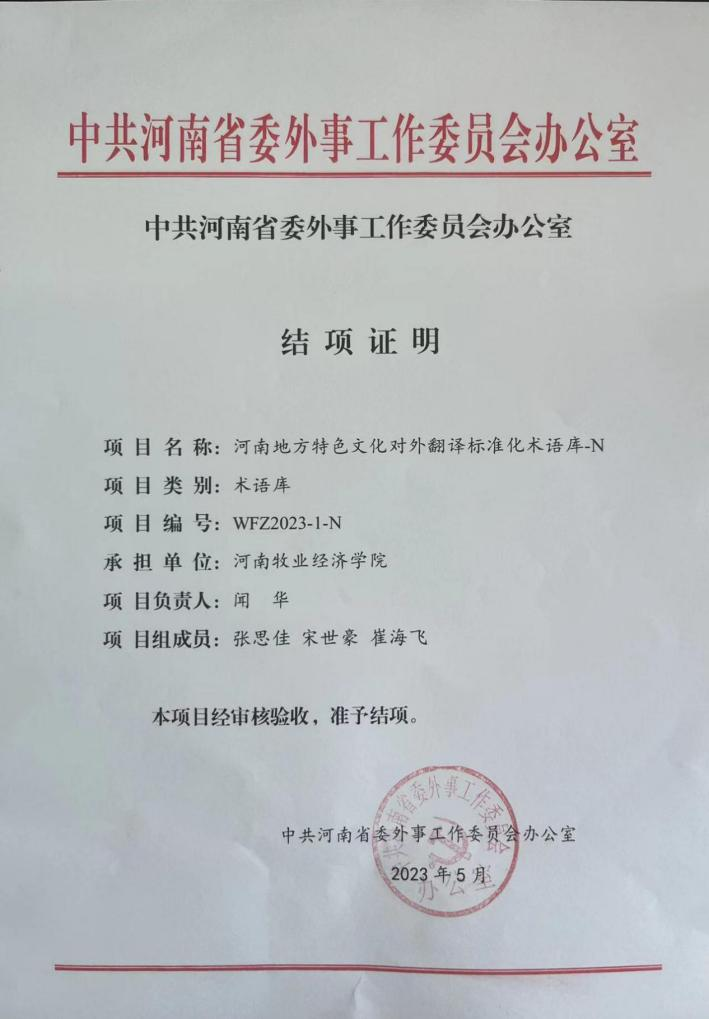 近日,由外国语学院承担的河南地方特色文化对外翻译标准化术语库·N项目,经过近一年的不懈努力,终于保质保量完成了完美官网分配术语的编译和入库工作,并获得河南省委外事工作委员会办公室的肯定。