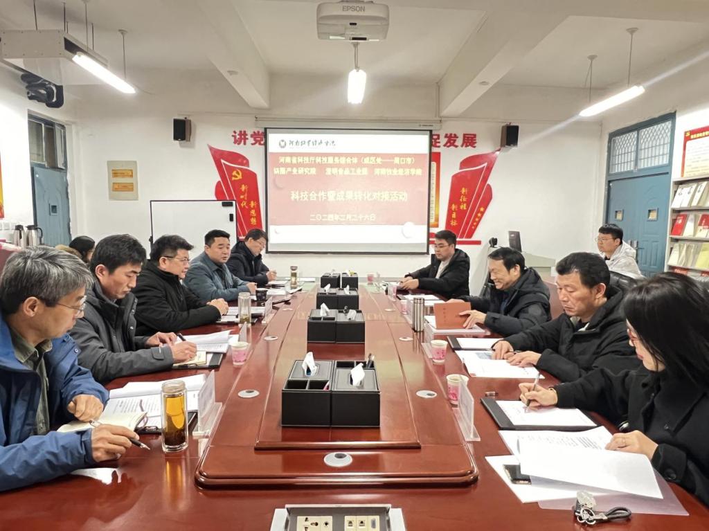 2月27日,周口市科技局四级调研员王朝华、周口市科技局法规科科长张东、澄明食品工业园主任程一鸣、澄明食品工业园技术部经理闫培到食品与生物工程学院开展科技合作暨成果转化对接活动。食品与生物工程学院党委书记赵安勇、院长邹建、副院长郑鸣、郭宏伟及学校科学技术处综合科科长郑立参加会议。会议由邹建主持。