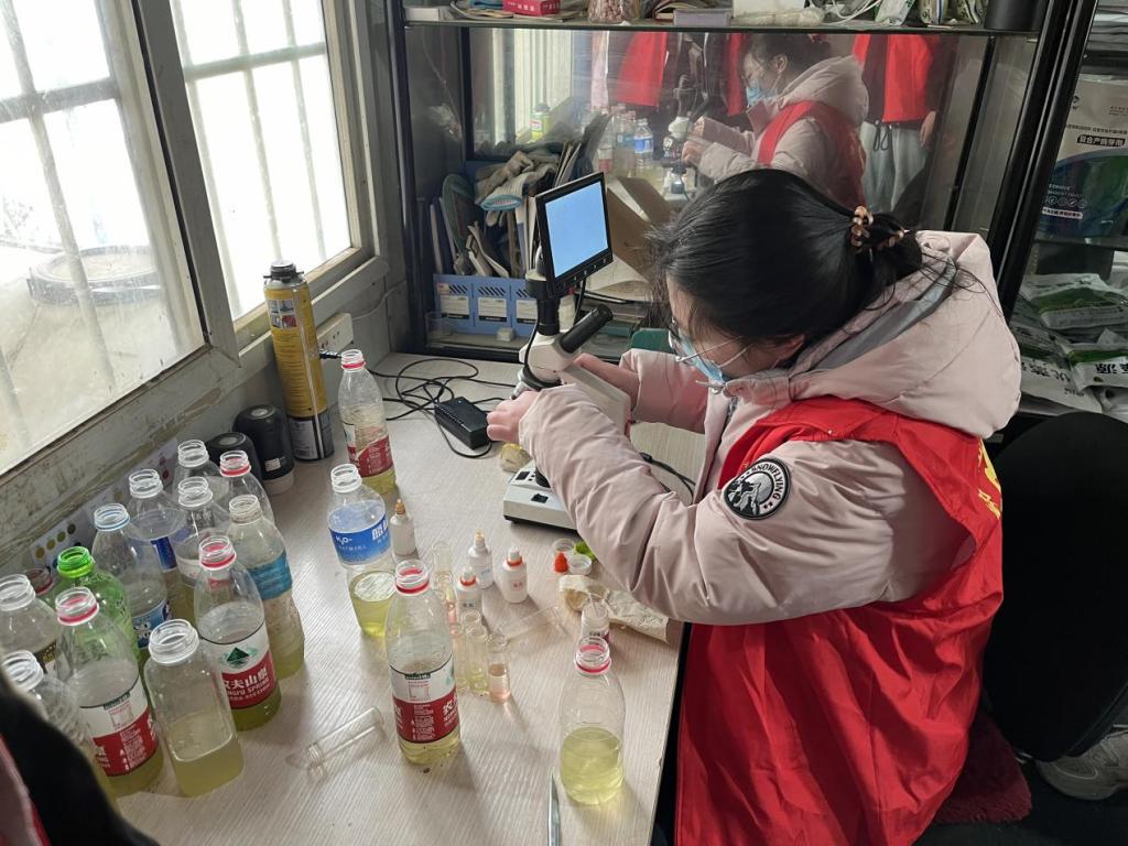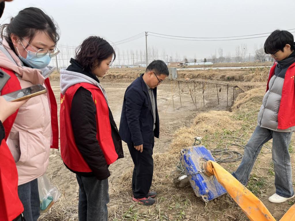 在西徐庄村,徐文彦一行结合养殖户情况,对其所养殖的清江鱼进行现场诊断和分析,对附近三个鱼塘水质进行取样,检测水中亚硝酸盐含量、氨氮含量、pH值和藻类情况。徐文彦根据检测结果有针对性的给出养殖建议和防范措施。在姚湾村,通过实地走访,徐文彦带领大学生志愿者了解鱼塘淤泥处理对于渔业养殖的重要性,并就地讲解鱼塘增氧浮水泵构造和工作原理。