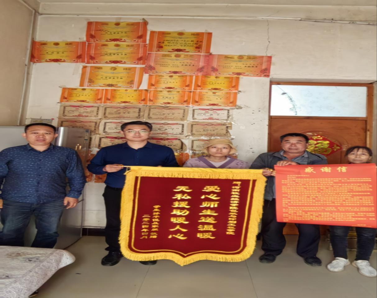 4月16日,学院党委书记杨军、副书记李帅堂驱车赶赴孙同学家中走访慰问,与孙同学及其家长展开交流,传递了学校领导、党委学工部和学院全体师生的慰问祝福与暖心鼓励,并将所筹善款悉数交给了孙同学家人。孙同学父亲满怀感激,热泪盈眶的说:“真诚感谢学校对孩子的暖心帮助,是你们用爱的力量让孩子获得战胜病魔的勇气,让我们全家走出了困境”。并向学院赠送了“爱心师生送温暖 无私援助暖人心”的锦旗和感谢信,以此感谢学校领导和师生对孙同学无私的关爱与帮助。